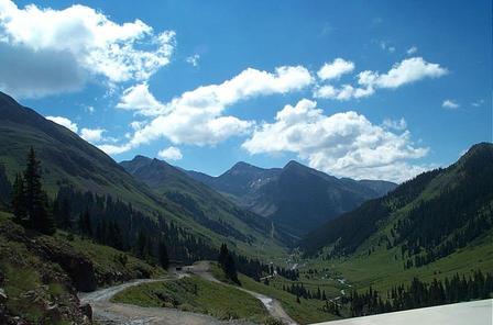 | This is the view as we dropped down into Animas Forks, an old ghost town not far from Silverton, CO. And these are the kind of roads that go through these mountain passes up here. Some of them go along cliff edges, and most are only wide enough for one vehicle. If you meet another vehicle, then someone has to back up to the nearest pull-off. It's pretty exciting. | ||||